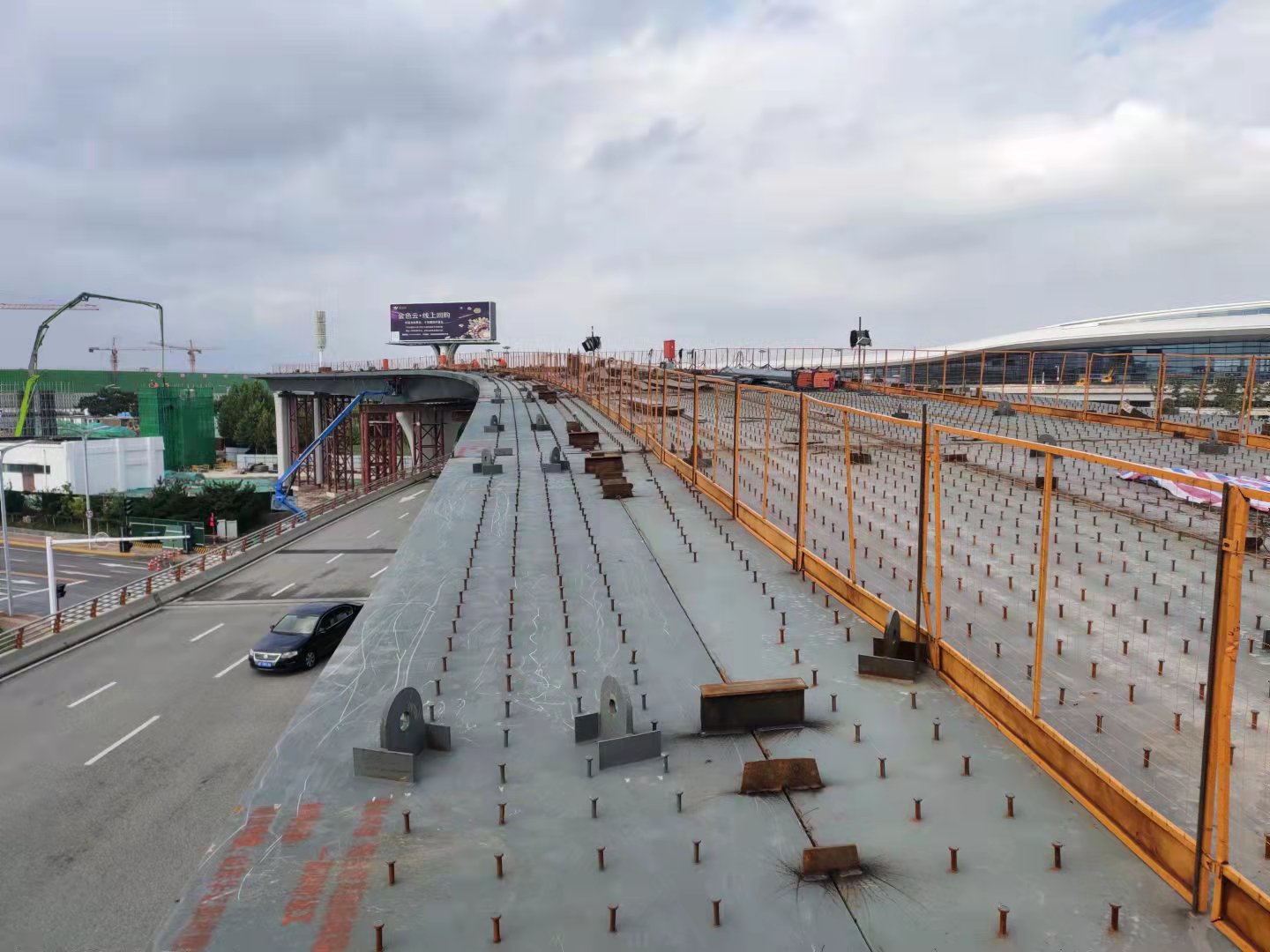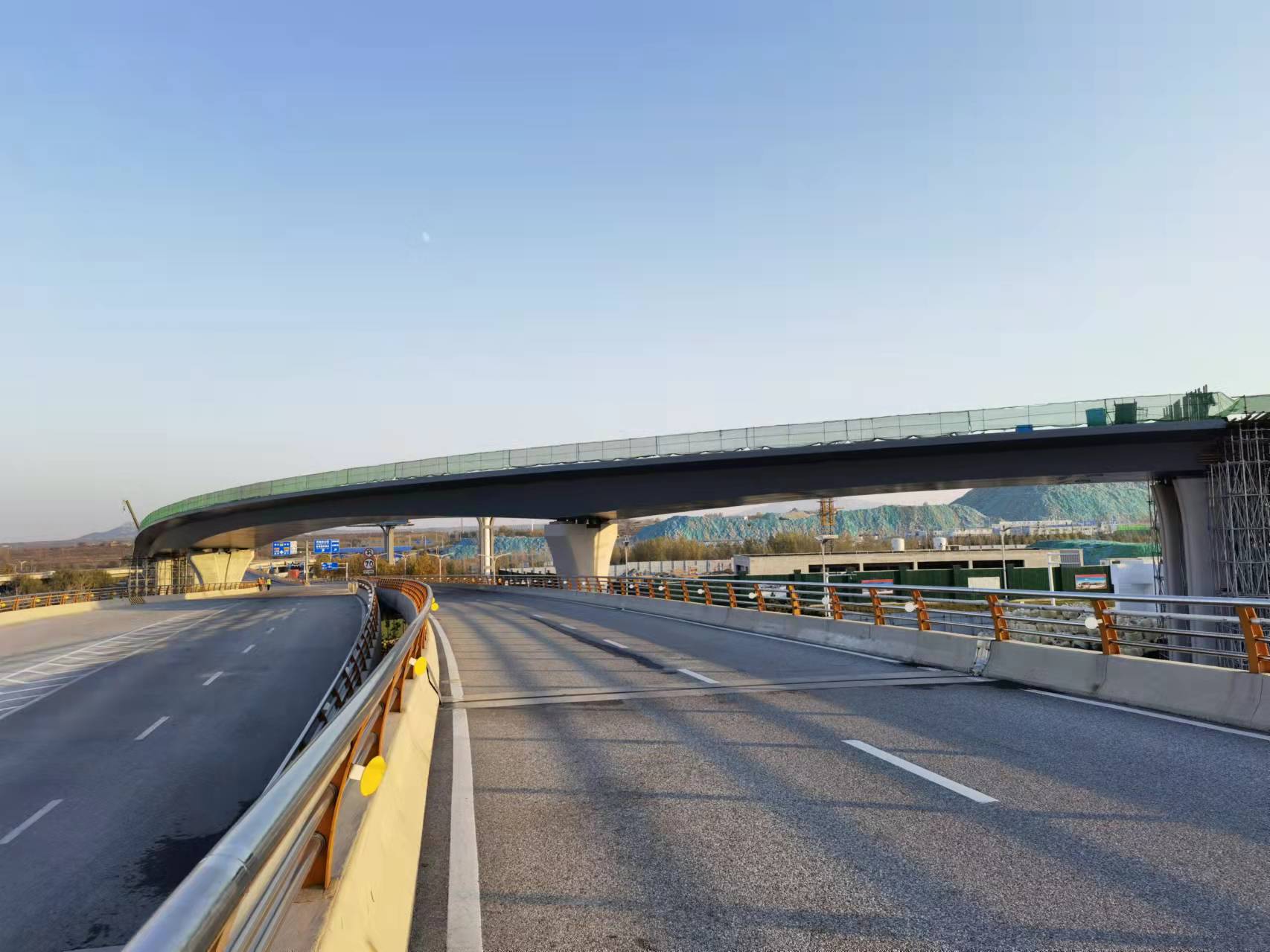 橋梁工程是煙臺蓬萊機場二期擴建工程的重要組成部分,也是整個項目的重要控制性工程。根據(jù)總體方案高架橋梁(G線)南起現(xiàn)狀T1進場高架處,沿T1高架向北跨過空港二路,與T1連接匝道(A線)合并,向西跨過迎賓九路、迎賓十路后到達T2航站樓,終點在航站樓西側(cè)向南轉(zhuǎn)彎后落地接地面出場道路,高架主線 (G線)總長度1635.104m。跨度為37米+62米+37米=136米,橋梁面積18565平方米,總用鋼量1300噸。