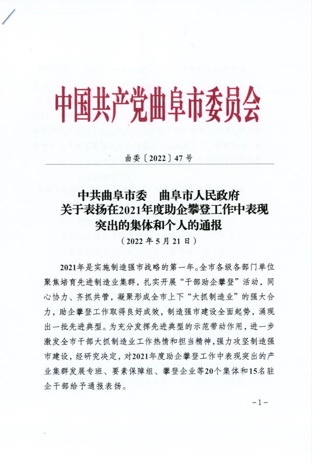 5月22日,曲阜市助企攀登工作會(huì)議召開,會(huì)議對(duì)助企攀登工作進(jìn)行階段性總結(jié),并對(duì)2021年度表現(xiàn)突出的集體和個(gè)人進(jìn)行了通報(bào)表揚(yáng),公司榮獲全市助企攀登突出集體。