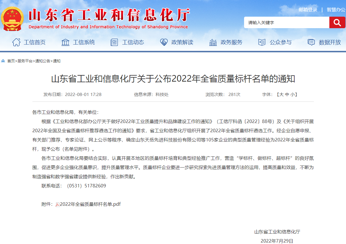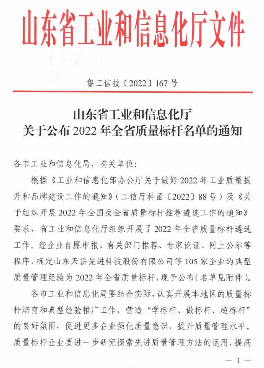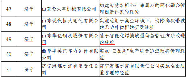 2022年7月29日,山東省工業(yè)和信息化廳發(fā)布了關(guān)于公布2022年全省質(zhì)量標(biāo)桿的通知,公司憑借“基于智能化焊接質(zhì)量偏差管理方法改進(jìn)的經(jīng)驗(yàn)”榮獲“2022年全省質(zhì)量標(biāo)桿企業(yè)”榮譽(yù)稱號(hào)。