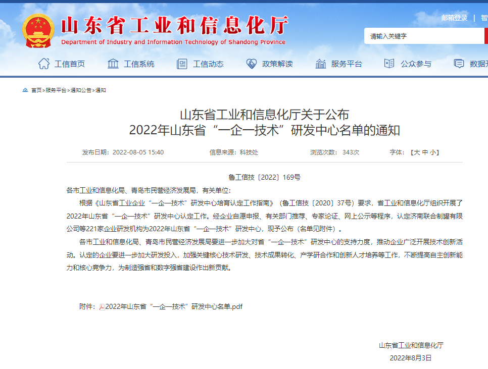 近日,省工信廳公布2022年山東省“一企一技術”研發(fā)中心名單,公司成功獲批,是曲阜市第8家省級“一企一技術”研發(fā)中心,同時也是本年度曲阜市唯一一家成功獲批該稱號企業(yè)。