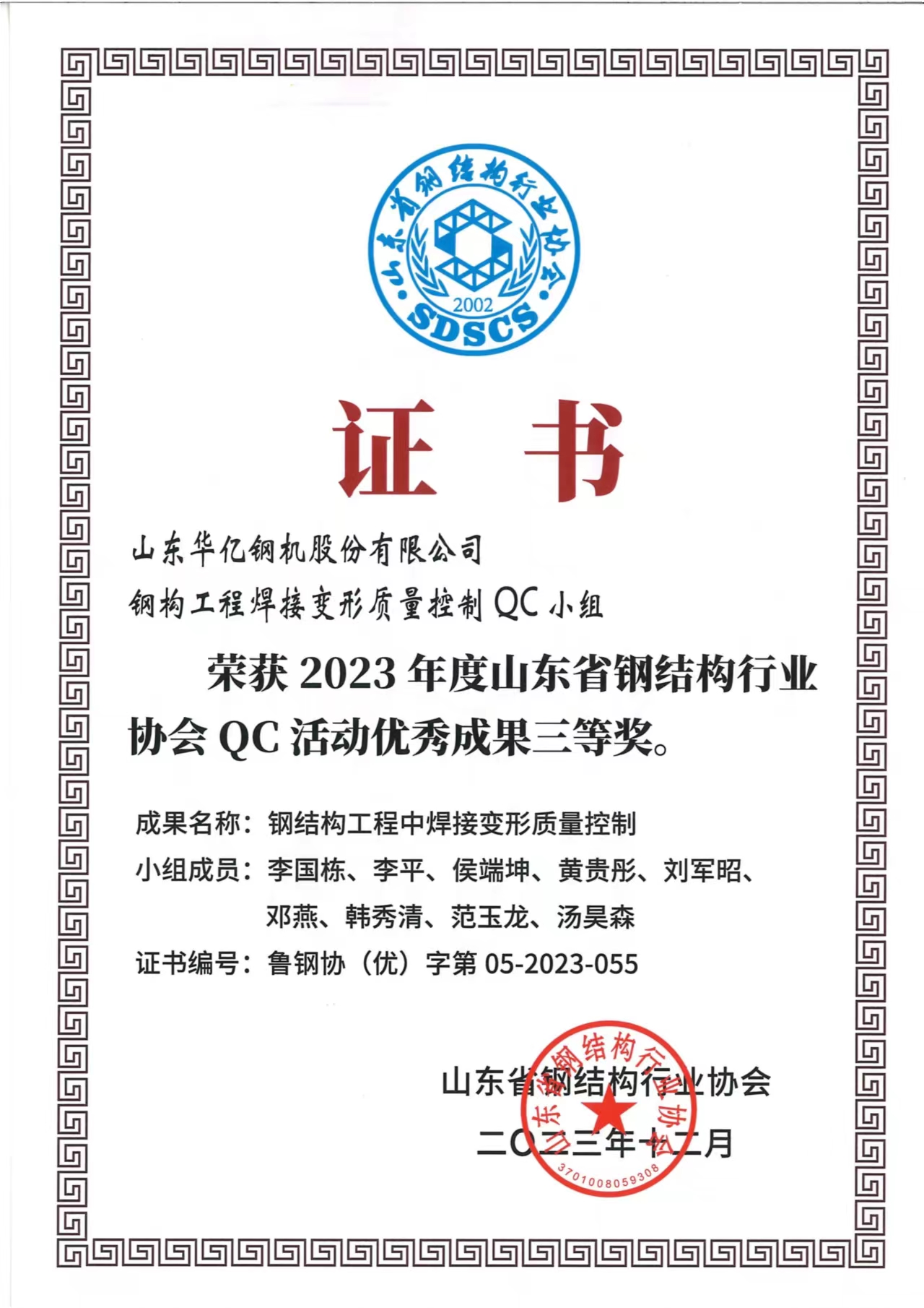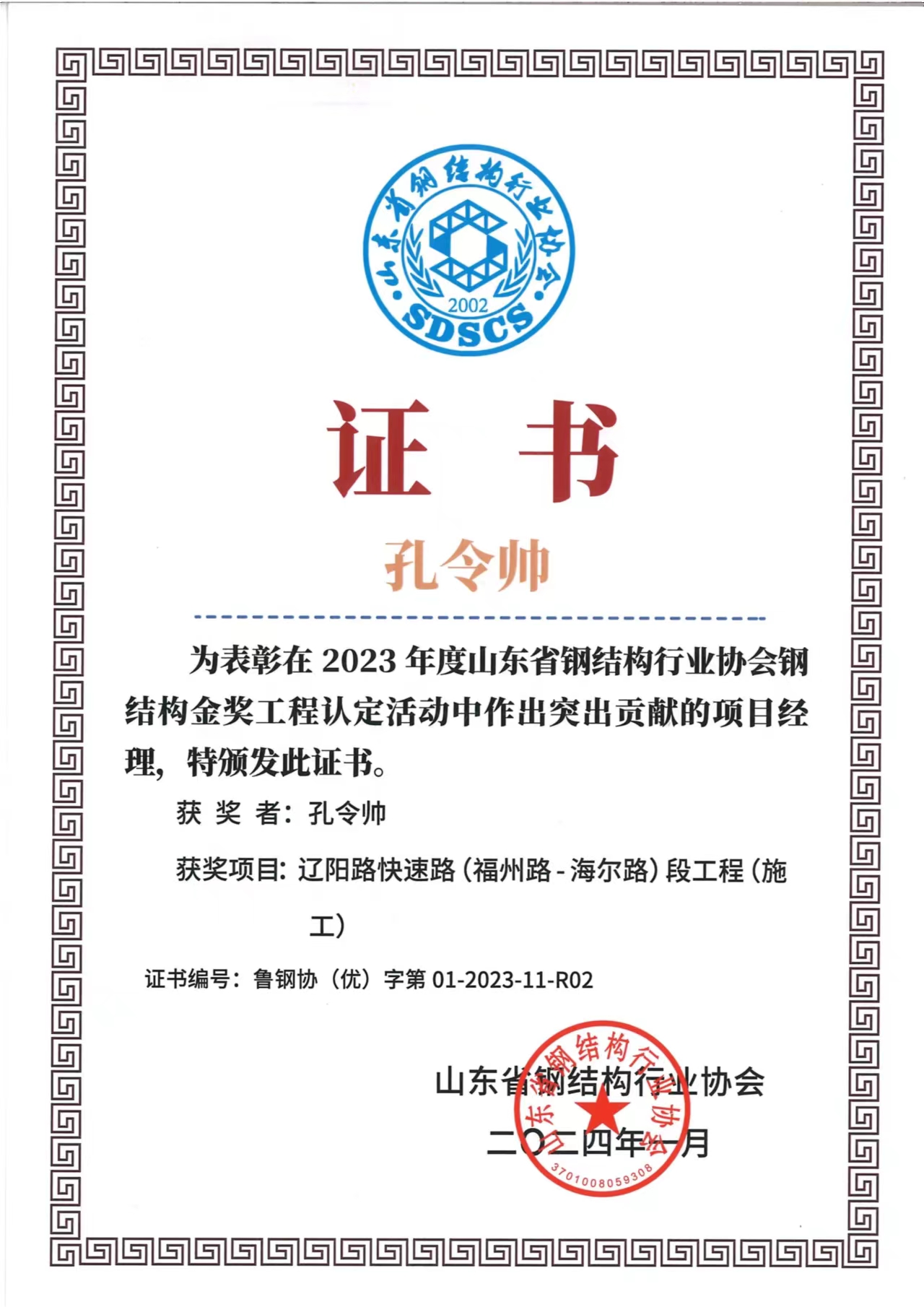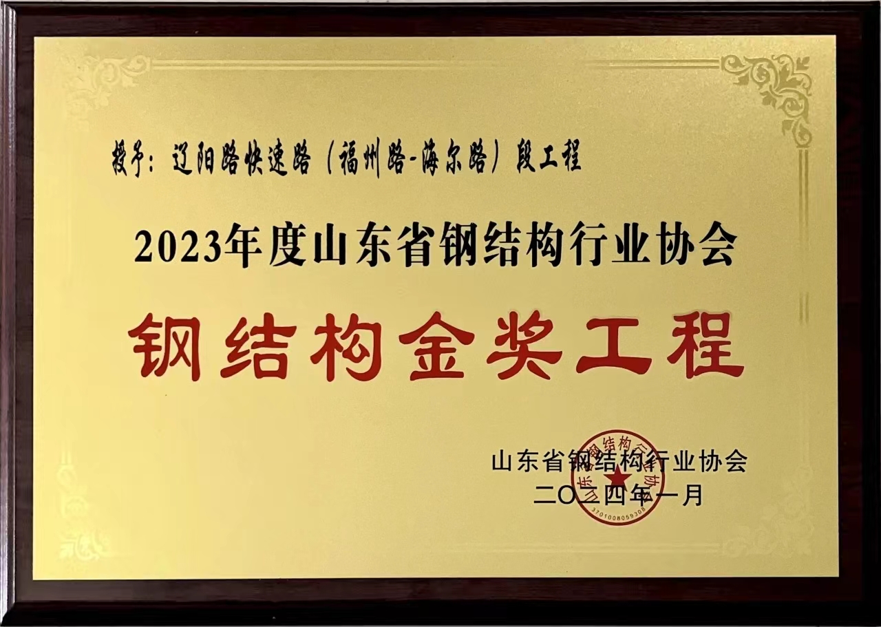 由公司承建的遼陽路快速路(福州路—海爾路)段工程(施工)榮獲2023年度山東省鋼結(jié)構(gòu)行業(yè)協(xié)會(huì)鋼結(jié)構(gòu)金獎(jiǎng)、孔令帥榮獲突出貢獻(xiàn)項(xiàng)目經(jīng)理,公司榮獲2023年度山東省鋼結(jié)構(gòu)行業(yè)協(xié)會(huì)科技創(chuàng)新優(yōu)秀企業(yè),公司副總經(jīng)理李平榮獲2023年度山東省鋼結(jié)構(gòu)行業(yè)協(xié)會(huì)(制造類)優(yōu)秀工匠,“大噸位液壓同步提升安裝工法”入選2023年度山東省鋼結(jié)構(gòu)行業(yè)協(xié)會(huì)工程建設(shè)工法名單,公司技術(shù)部QC小組榮獲2023年度山東省鋼結(jié)構(gòu)行業(yè)協(xié)會(huì)QC活動(dòng)優(yōu)秀成功二等獎(jiǎng),公司鋼構(gòu)工程焊接變形質(zhì)量控制QC小組榮獲2023年度山東省鋼結(jié)構(gòu)行業(yè)協(xié)會(huì)QC活動(dòng)優(yōu)秀成果三等獎(jiǎng)。
