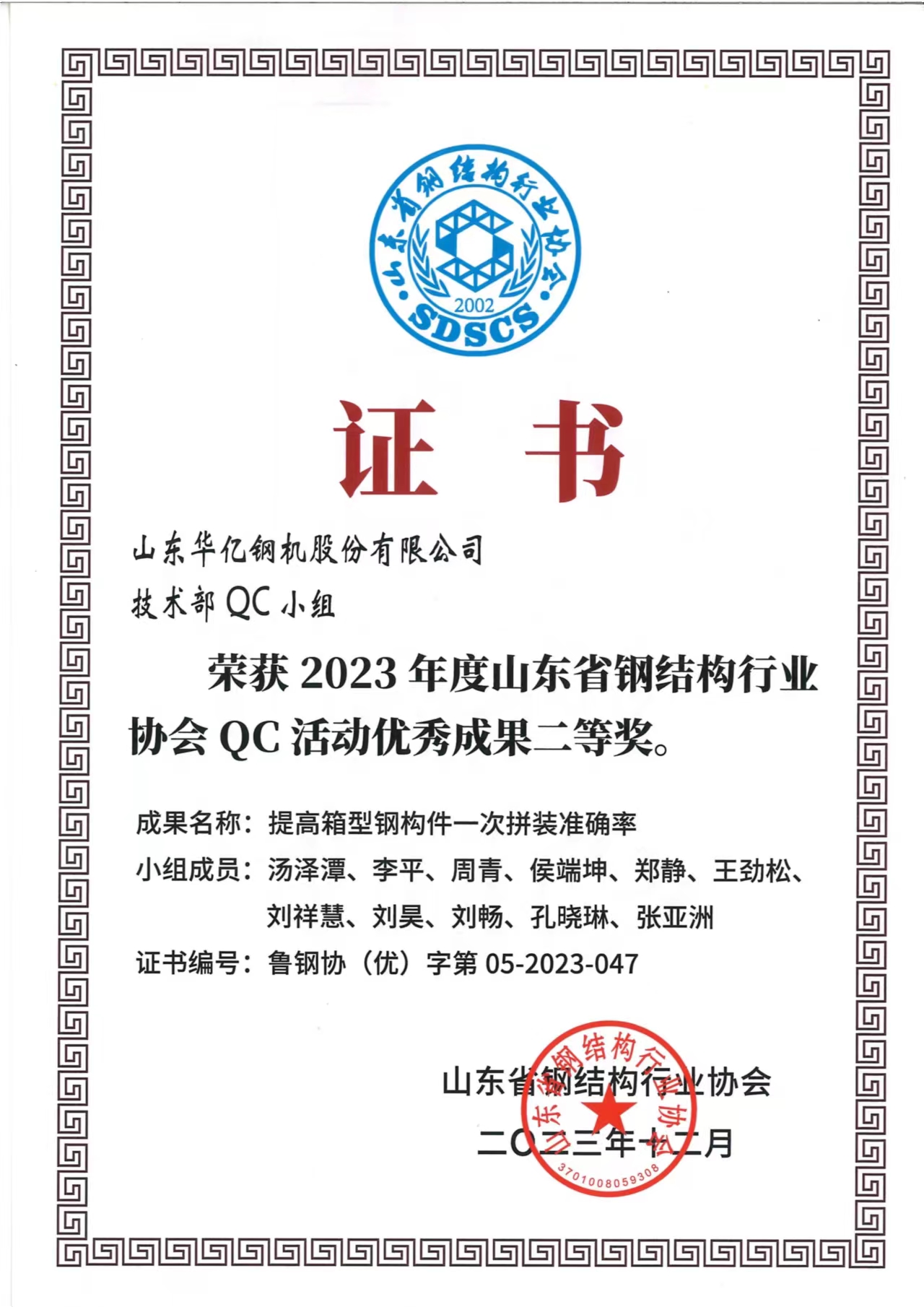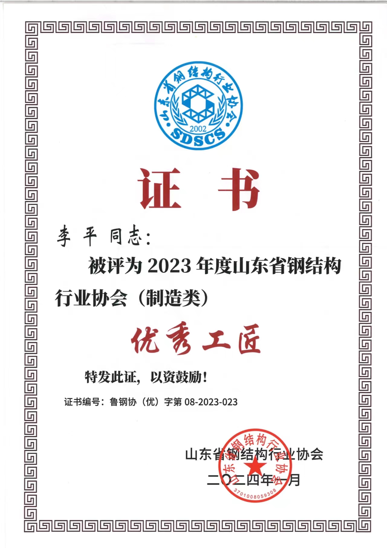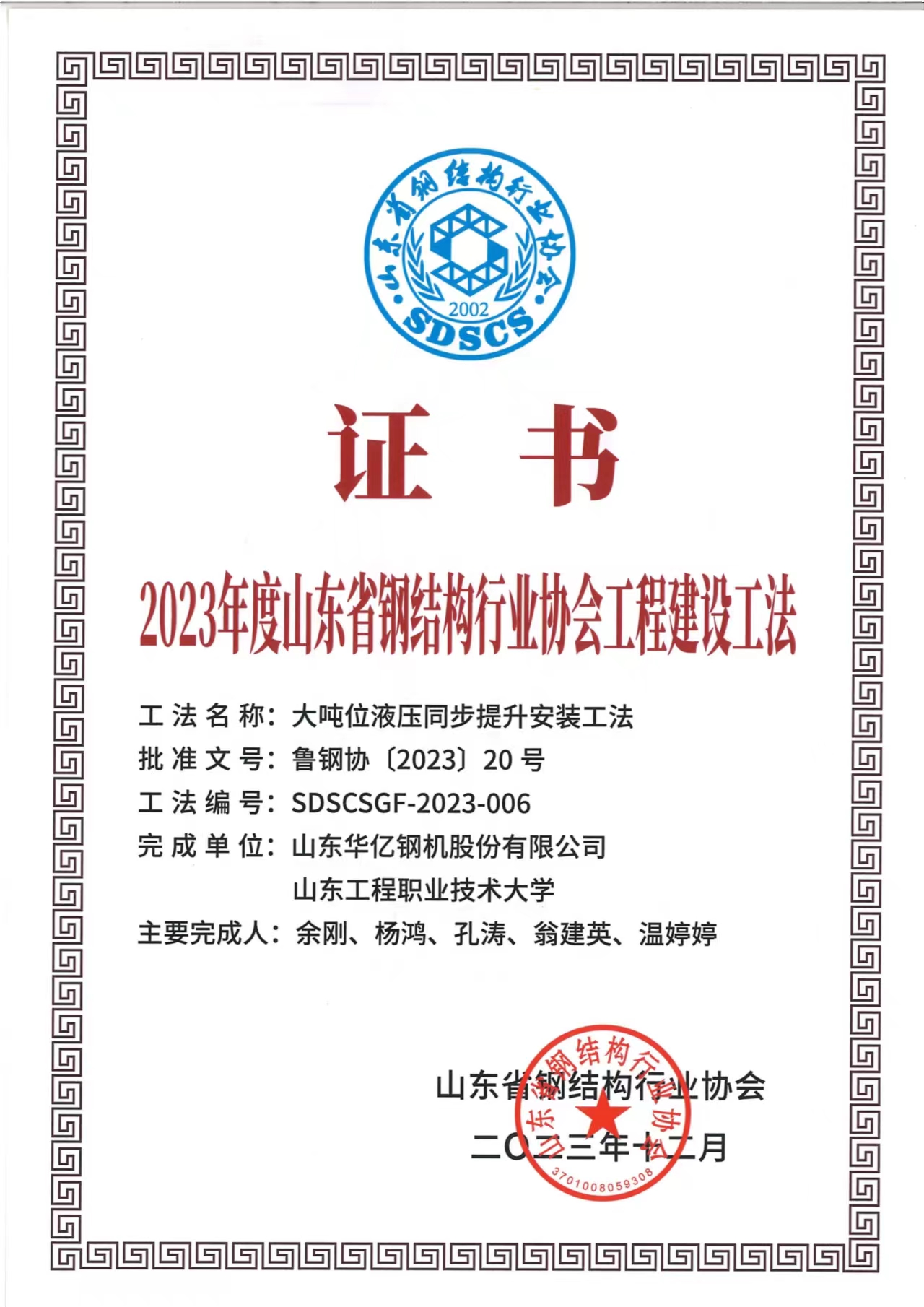 由公司承建的遼陽路快速路(福州路—海爾路)段工程(施工)榮獲2023年度山東省鋼結(jié)構(gòu)行業(yè)協(xié)會(huì)鋼結(jié)構(gòu)金獎(jiǎng)、孔令帥榮獲突出貢獻(xiàn)項(xiàng)目經(jīng)理,公司榮獲2023年度山東省鋼結(jié)構(gòu)行業(yè)協(xié)會(huì)科技創(chuàng)新優(yōu)秀企業(yè),公司副總經(jīng)理李平榮獲2023年度山東省鋼結(jié)構(gòu)行業(yè)協(xié)會(huì)(制造類)優(yōu)秀工匠,“大噸位液壓同步提升安裝工法”入選2023年度山東省鋼結(jié)構(gòu)行業(yè)協(xié)會(huì)工程建設(shè)工法名單,公司技術(shù)部QC小組榮獲2023年度山東省鋼結(jié)構(gòu)行業(yè)協(xié)會(huì)QC活動(dòng)優(yōu)秀成功二等獎(jiǎng),公司鋼構(gòu)工程焊接變形質(zhì)量控制QC小組榮獲2023年度山東省鋼結(jié)構(gòu)行業(yè)協(xié)會(huì)QC活動(dòng)優(yōu)秀成果三等獎(jiǎng)。