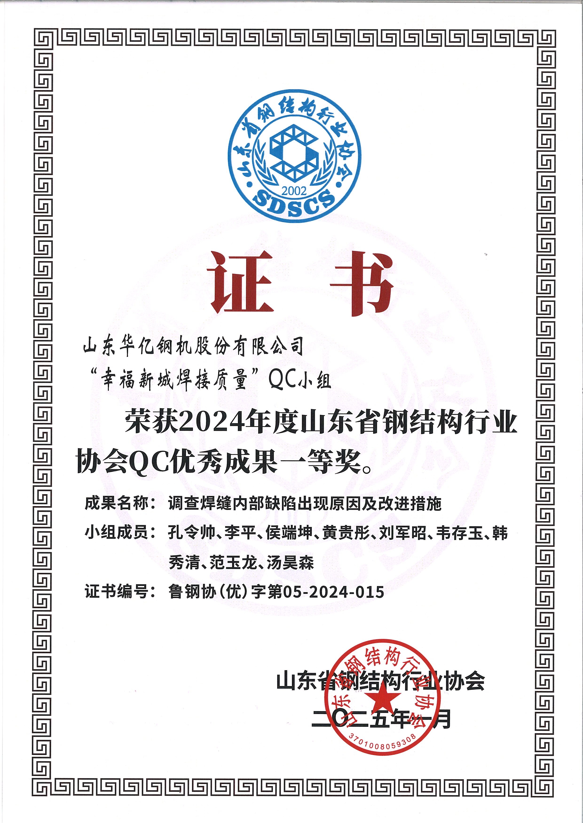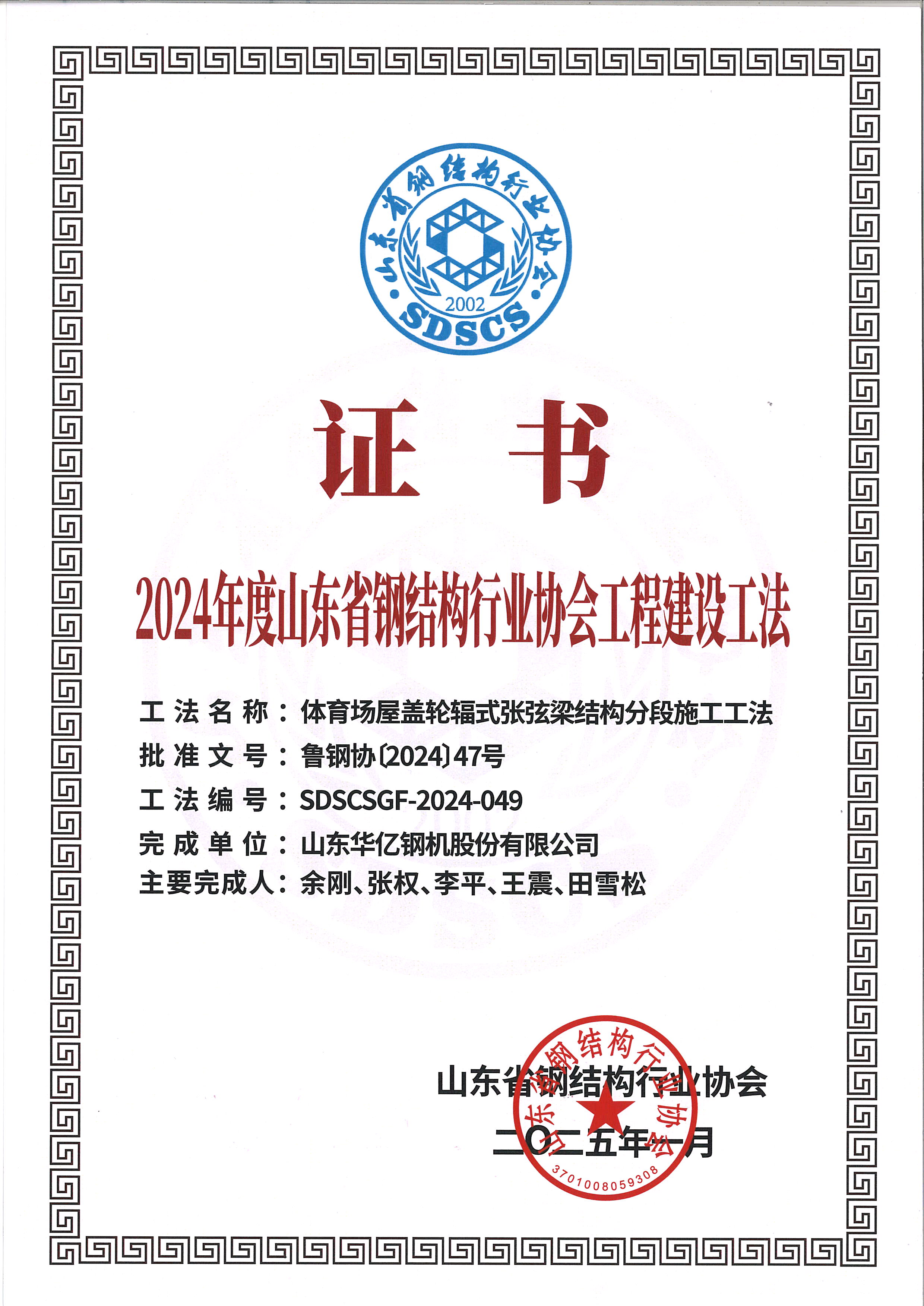公司“幸福新城焊接質量”QC小組榮獲2024年度山東省鋼結構行業(yè)協(xié)會QC優(yōu)秀成果一等獎,“體育場屋蓋輪輻式張弦梁結構分段施工工法”入選2024年度山東省鋼結構行業(yè)協(xié)會工程建設工法