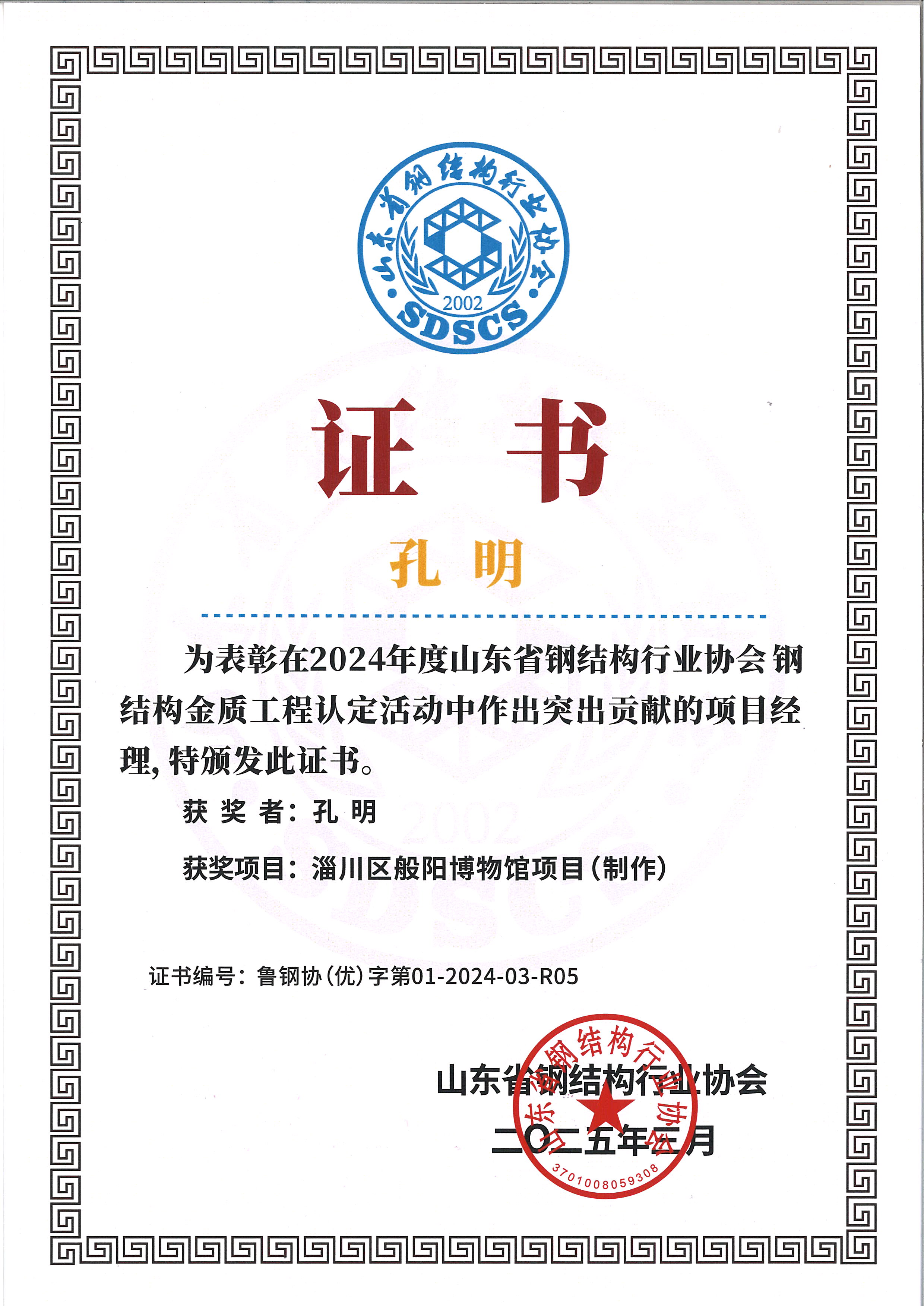公司參建的淄川區(qū)般陽博物館項目、淄博師范高等??茖W校產教融合實訓基地一期項目圖書館榮獲山東省鋼結構行業(yè)協(xié)會鋼結構金質工程獎;孔令帥、孔明榮獲突出貢獻項目經理。